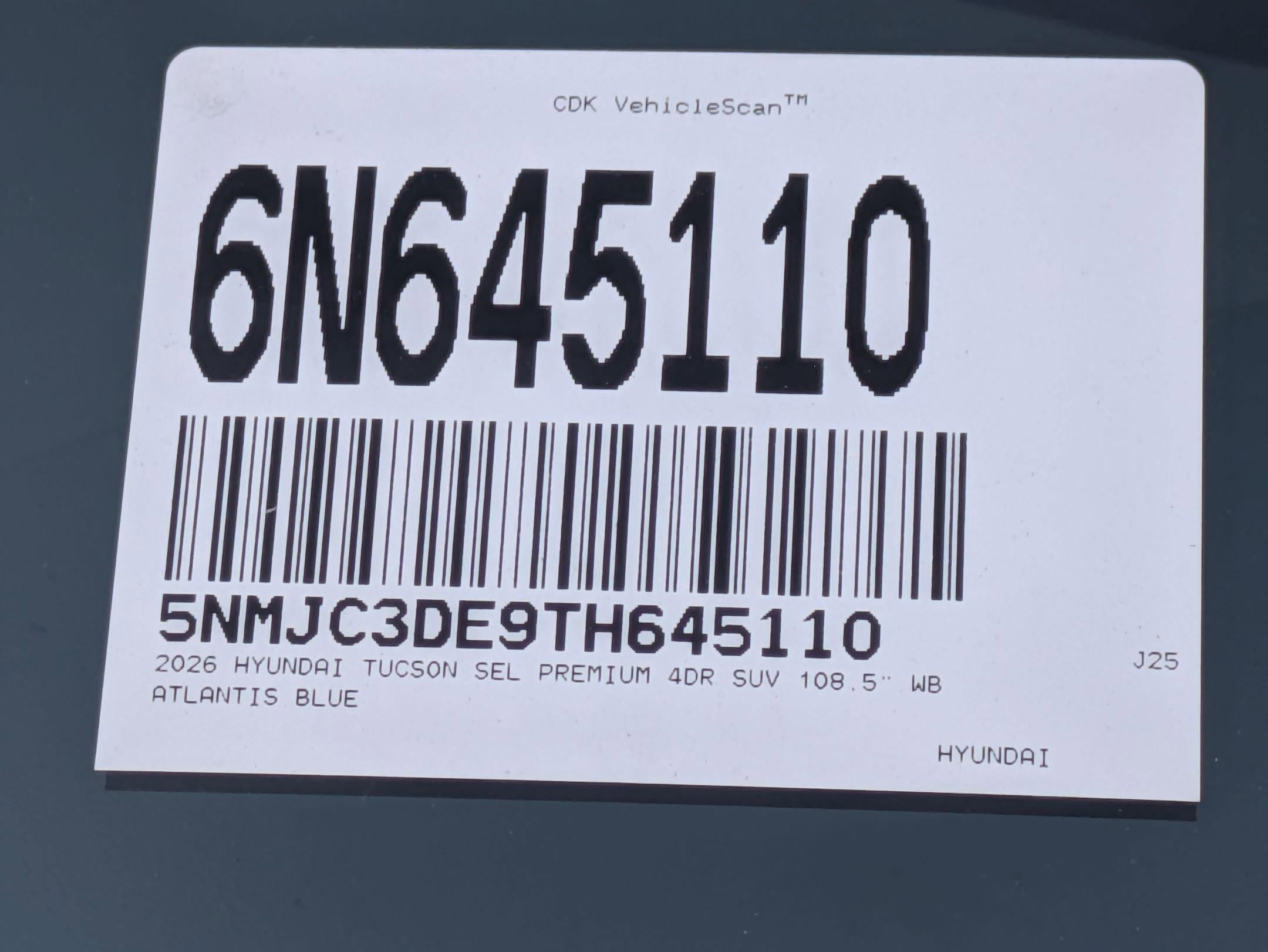 2026 Hyundai Tucson SEL Premium KBB Fair Market Range High: $34,500 KBB Fair Market Range Low: $32,30025/33 City/Highway MPG 4D Sport Utility Atlantis Blue 2026 Hyundai Tucson SEL Premium FWD 8-Speed Automatic with SHIFTRONIC 2.5L I4 DGI DOHC 16V LEV3-SULEV30 187hp25/33 City/Highway MPG Price includes: $1000 - Hyundai HMF Dealer Choice : $1000 discount and 5.39% APR for 24 months. $44.05 per $1000 financed. Available to well qualified buyers who finance through Hyundai Motor Finance. H704. Exp. 02/02/2026