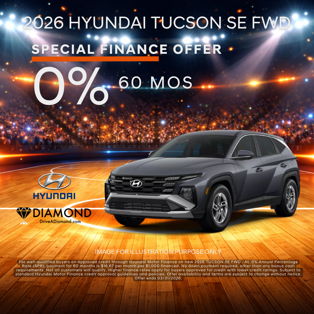 For well-qualified buyers on approved credit through Hyundai Motor Finance on new 2026 TUCSON SE FWD . At .0% Annual Percentage Rate (APR), payment for 60 months is $16.67 per month per $1,000 financed. No down payment required, other than any bonus cash requirements. Not all customers will qualify. Higher finance rates apply for buyers approved for credit with lower credit ratings. Subject to standard Hyundai Motor Finance credit approval guidelines and policies. Offer availability and terms are subject to change without notice. Offer ends 03/31/2026.
