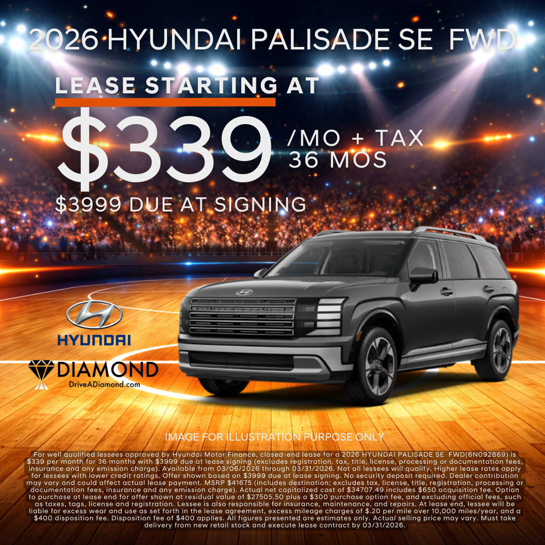 For well qualified lessees approved by Hyundai Motor Finance, closed-end lease for a 2026 HYUNDAI PALISADE SE FWD(6N092869) is $339 per month for 36 months with $3999 due at lease signing (excludes registration, tax, title, license, processing or documentation fees, insurance and any emission charge). Available from 03/06/2026 through 03/31/2026. Not all lessees will qualify. Higher lease rates apply for lessees with lower credit ratings. Offer shown based on $3999 due at lease signing. No security deposit required. Dealer contribution may vary and could affect actual lease payment. MSRP $41675 (includes destination; excludes tax, license, title, registration, processing or documentation fees, insurance and any emission charge). Actual net capitalized cost of $34707.49 includes $650 acquisition fee. Option to purchase at lease end for offer shown at residual value of $27505.50 plus a $300 purchase option fee, and excluding official fees, such as taxes, tags, license and registration. Lessee is also responsible for insurance, maintenance, and repairs. At lease end, lessee will be liable for excess wear and use as set forth in the lease agreement, excess mileage charges of $.20 per mile over 10,000 miles/year, and a $400 disposition fee. Disposition fee of $400 applies. All figures presented are estimates only. Actual selling price may vary. Must take delivery from new retail stock and execute lease contract by 03/31/2026.