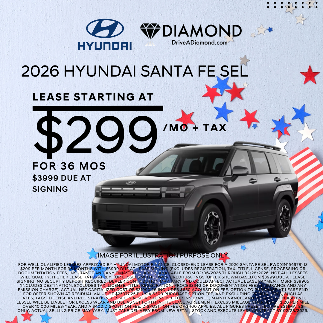 For well qualified lessees approved by Hyundai Motor Finance, closed-end lease for a 2026 SANTA FE SEL FWD(6N154978) is $299 per month for 36 months with $3999 due at lease signing (excludes registration, tax, title, license, processing or documentation fees, insurance and any emission charge). Available from 02/06/2026 through 02/28/2026. Not all lessees will qualify. Higher lease rates apply for lessees with lower credit ratings. Offer shown based on $3999 due at lease signing. No security deposit required. Dealer contribution may vary and could affect actual lease payment. MSRP $39965 (includes destination; excludes tax, license, title, registration, processing or documentation fees, insurance and any emission charge). Actual net capitalized cost of $31990.26 includes $650 acquisition fee. Option to purchase at lease end for offer shown at residual value of $25977.25 plus a $300 purchase option fee, and excluding official fees, such as taxes, tags, license and registration. Lessee is also responsible for insurance, maintenance, and repairs. At lease end, lessee will be liable for excess wear and use as set forth in the lease agreement, excess mileage charges of $.20 per mile over 10,000 miles/year, and a $400 disposition fee. Disposition fee of $400 applies. All figures presented are estimates only. Actual selling price may vary. Must take delivery from new retail stock and execute lease contract by 02/28/2026.