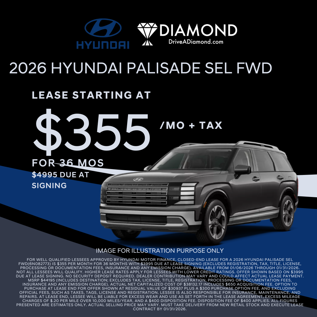 For well qualified lessees approved by Hyundai Motor Finance, closed-end lease for a 2026 HYUNDAI PALISADE SEL FWD(6N082773) is $355 per month for 36 months with $3995 due at lease signing (excludes registration, tax, title, license, processing or documentation fees, insurance and any emission charge). Available from 01/06/2026 through 01/31/2026. Not all lessees will qualify. Higher lease rates apply for lessees with lower credit ratings. Offer shown based on $3995 due at lease signing. No security deposit required. Dealer contribution may vary and could affect actual lease payment. MSRP $44195 (includes destination; excludes tax, license, title, registration, processing or documentation fees, insurance and any emission charge). Actual net capitalized cost of $38132.17 includes $650 acquisition fee. Option to purchase at lease end for offer shown at residual value of $30937 plus a $300 purchase option fee, and excluding official fees, such as taxes, tags, license and registration. Lessee is also responsible for insurance, maintenance, and repairs. At lease end, lessee will be liable for excess wear and use as set forth in the lease agreement, excess mileage charges of $.20 per mile over 10,000 miles/year, and a $400 disposition fee. Disposition fee of $400 applies. All figures presented are estimates only. Actual selling price may vary. Must take delivery from new retail stock and execute lease contract by 01/31/2026.